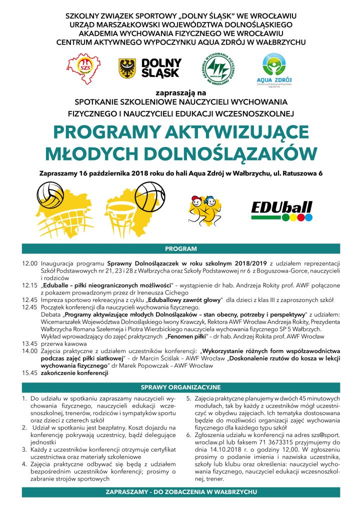 W dniu 16.10.18 o godzinie 12:00 w Centrum Sportowo-Rekreacyjnym Aqua Zdrój w Wałbrzychu zaplanowane zostało spotkanie z nauczycielami wychowania fizycznego oraz edukacji wczesnoszkolnej. Motywem przewodnim będą Programy Aktywizujące Młodych Dolnoślązaków.