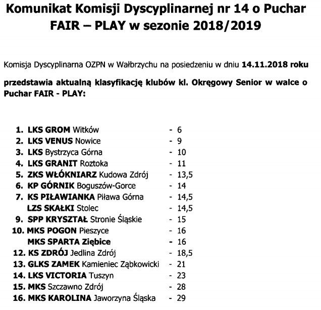 Komisja Dyscyplinarna Okręgowego Związku Piłki Nożnej w Wałbrzychu ogłosiła Komunikat dotyczący rywalizacji o Puchar Fair-Play w sezonie 2018/2019 w Lidze Okręgowej. Klasyfikacja układana jest na podstawie otrzymanych w rozgrywkach żółtych i czerwonych kartek. Im mniej punktów, tym mniej otrzymanych kartek, a co za tym idzie, tym bliżej nagrody.