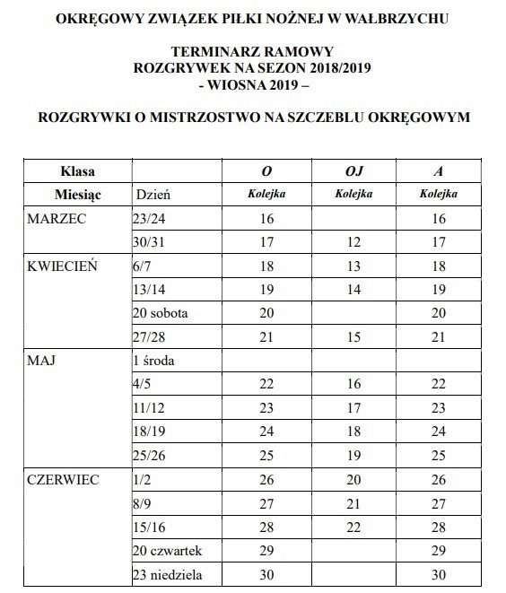 Okręgowy Związek Piłki Nożnej ogłosił ramowy terminarz na szczeblu okręgowym, rundy wiosennej sezonu 2018/2019. Dowiedzieliśmy się z niego, że piłkarze wrócą na boiska w dwóch terminach.