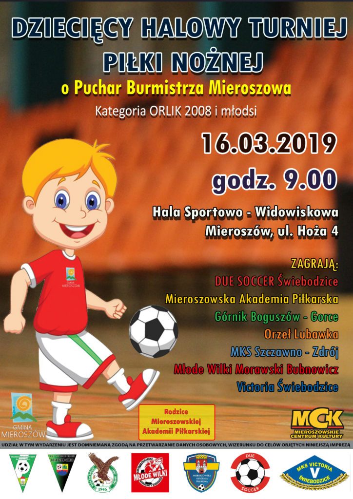 Serdecznie zapraszamy mieszkańców, młodzież z naszej gminy do kibicowania zespołom, które będą uczestniczyć w Dziecięcym Halowym Turnieju Piłki Nożnej o Puchar Burmistrza Mieroszowa.