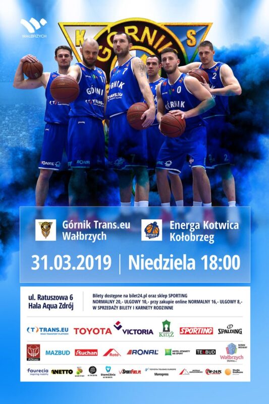 W niedzielę 31 marca 2019 o godz. 18:00 zapraszamy na mecz Górnik Trans.eu Wałbrzych vs Energa Kotwica Kołobrzeg. Spotkanie odbędzie się w Hali Widowiskowo-Sportowej Aqua Zdrój.