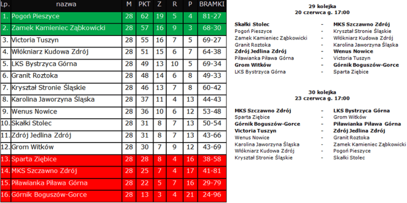 W najlepszej sytuacji z drużyn z naszego regionu w dalszym ciągu pozostaje Zdrój Jedlina Zdrój. W Jaworzynie Śląskiej zawodnicy Zdroju zadali da szybkie ciosy. W 25 minucie trafił Rzeszót, zaledwie 60 sekund później Kałwak. Brawo dla drużyny za walkę do końca. Ostatnie dwa spotkania powinny jedynie potwierdzić aspiracje drużyny do pozostania w lidze.