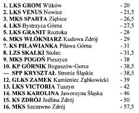 Najlepszą drużyną z Powiatu Wałbrzyskiego była młoda ekipa Górnika Boguszów Gorce, która zajęła 10 miejsce. Na drugim był zespół Zdroju Jedliny Zdrój (15 miejsce w ogólnej klasyfikacji), na trzecim MKS Szczawno Zdrój (16 miejsce/ostatnie w ogólnej klasyfikacji).