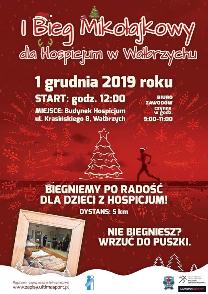 Już 1 grudnia odbędzie się I Bieg Mikołajowy dla Hospicjum. Będzie to szczególna akcja charytatywna. Start zaplanowano na godzinę 12:00. Organizatorem zawodów są Polskie Towarzystwo Opieki Paliatywnej, LKS Unia Bogaczowice sekcja biegowa, OSP Stare Bogaczowice, Nieformalna grupa biegowa z Wałbrzycha i okolic „Kłosowscy”