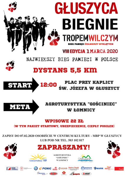 W niedzielę 1 marca 2020 r. zapraszamy miłośników aktywnego wypoczynku, młodzież i dzieci z rodzicami do udziału w głuszyckiej edycji ogólnopolskiego wydarzenia pn. Tropem Wilczym. Bieg Pamięci Żołnierzy Wyklętych.