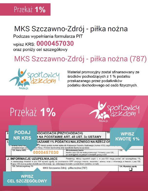 Kolejnym działaniem, które na początku każdego roku odbywa się chyba w każdym klubie, jest zbiórka poprzez 1% podatku. W tym roku MKS Szczawno-Zdrój nawiązał współpracę z Fundacją Sportowcy Dzieciom z Łodzi, dzięki której może zbierać środki na wsparcie i rozwój swojej działalności. Każdy, kto chciałby wspomóc klub ze Szczawna, proszony jest o wpisanie w rozliczeniu podatkowym za rok 2019 numeru KRS: 0000457030 oraz wpisanie celu szczegółowego: MKS Szczawno-Zdrój – piłka nożna (787). Bardzo ważne jest, aby osoby, które zdecydują się na wsparcie MINERALNYCH, wpisali cel szczegółowy, aby przekazane środki trafiły właśnie do MKS-u.