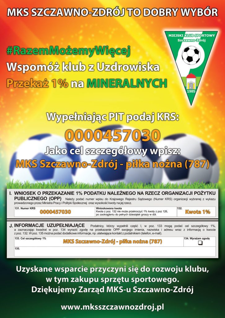 Kolejnym działaniem, które na początku każdego roku odbywa się chyba w każdym klubie, jest zbiórka poprzez 1% podatku. W tym roku MKS Szczawno-Zdrój nawiązał współpracę z Fundacją Sportowcy Dzieciom z Łodzi, dzięki której może zbierać środki na wsparcie i rozwój swojej działalności. Każdy, kto chciałby wspomóc klub ze Szczawna, proszony jest o wpisanie w rozliczeniu podatkowym za rok 2019 numeru KRS: 0000457030 oraz wpisanie celu szczegółowego: MKS Szczawno-Zdrój – piłka nożna (787). Bardzo ważne jest, aby osoby, które zdecydują się na wsparcie MINERALNYCH, wpisali cel szczegółowy, aby przekazane środki trafiły właśnie do MKS-u.