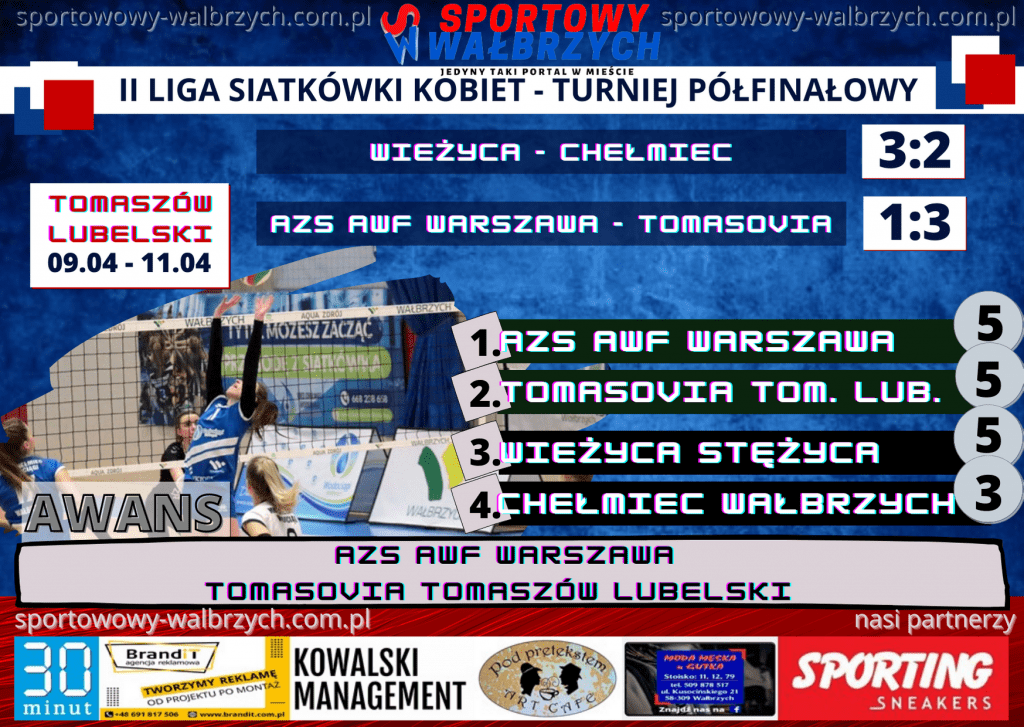 Po trzech dniach zmagań zakończył się półfinałowy turniej siatkówki kobiet. Awans do ostatecznego etapu rywalizacji o I ligę uzyskały AZSAWF Warszawa i Tomasovia Tomaszów Lubelski.