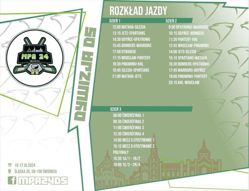 Od piątku do niedzieli (15-17.03) nie będzie ogólnodostępnych ślizgawek! Zapraszamy jednak do odwiedzin i kibicowania uczestnikom Mistrzostwa Polski Amatorów w hokeju na lodzie 2024 Dywizja V z udziałem Klub Hokejowy Odyńce Świdnica