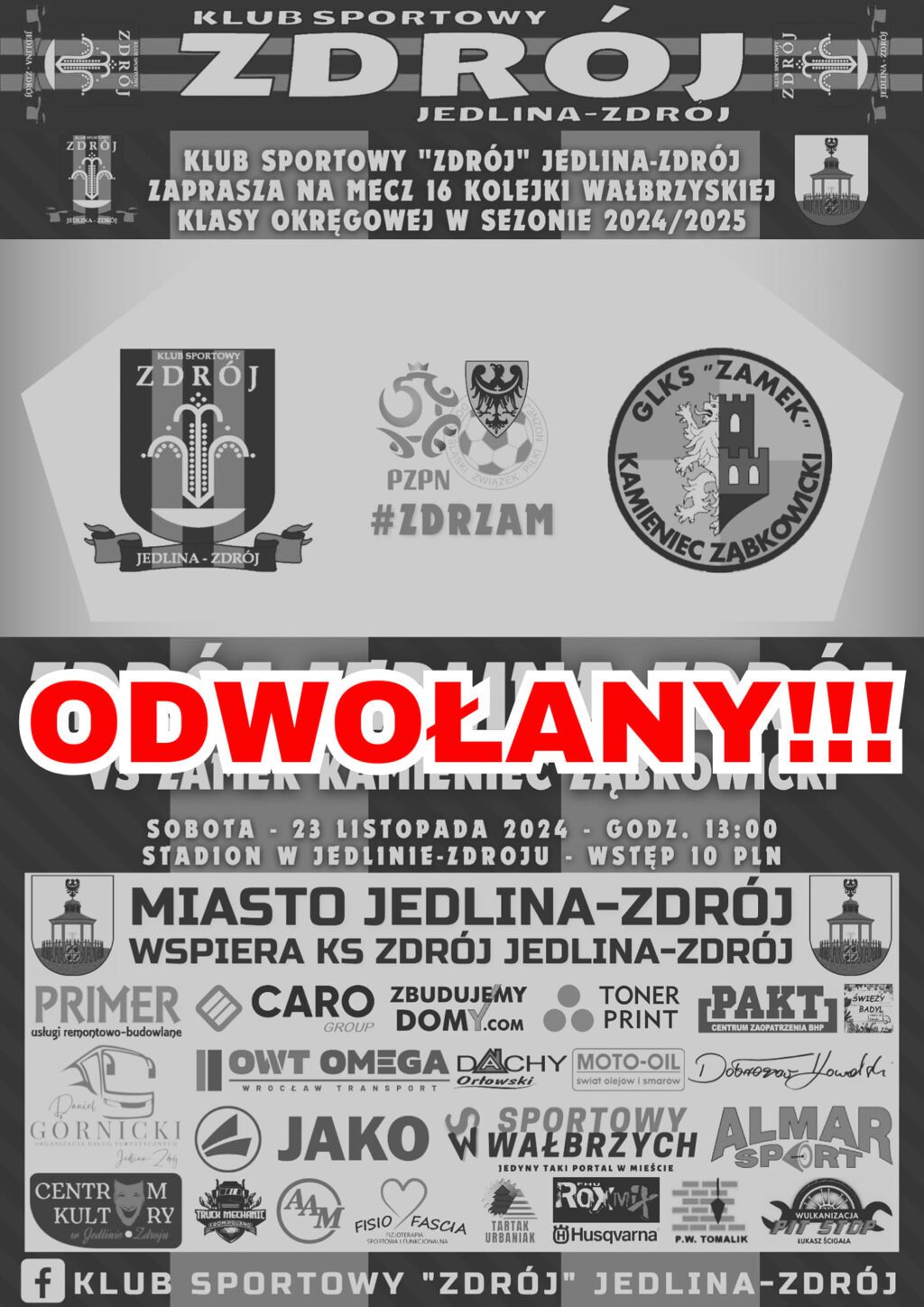 Informujemy, że spotkanie 16 kolejki rozgrywek o mistrzostwo wałbrzyskiej Klasy Okręgowej pomiędzy naszym Zdrojem a Zamek Kamieniec Ząbkowicki, które miało zostać rozegrane w najbliższą sobotę, 23 listopada 2024 roku na Stadionie w Jedlinie-Zdroju zostaje odwołane z powodu niesprzyjających warunków atmosferycznych oraz prognoz zapowiadających dalszą zimową aurę przez cały jutrzejszy dzień.