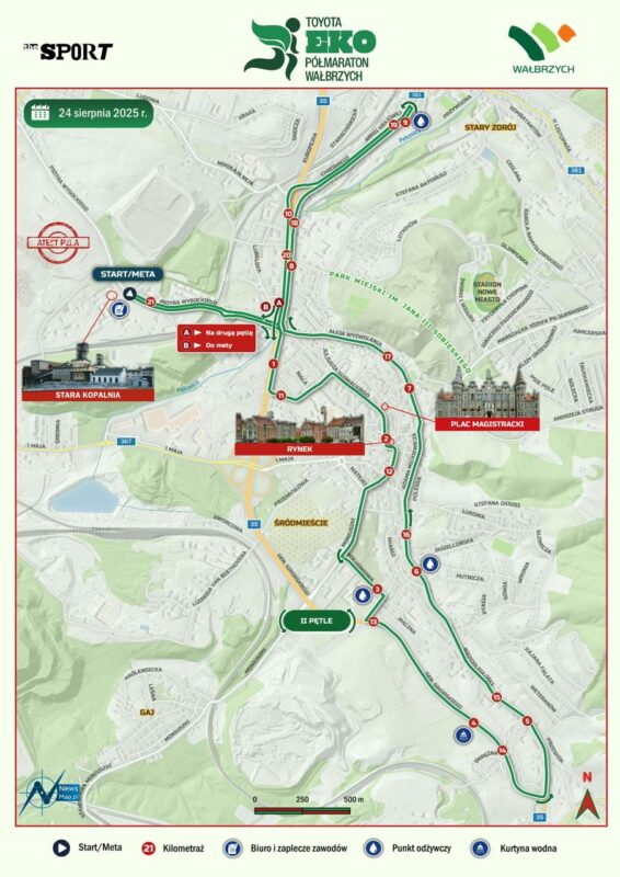 Przebieg trasy i ulice objęte zamknięciem. Start i meta biegu znajdować się będą na terenie Starej Kopalni przy ul. Piotra Wysockiego. Trasa przebiega przez malownicze zakątki naszego miasta, w tym Rynek i Plac Magistracki. Wykaz ulic, którymi pobiegną uczestnicy 25. edycji Toyota EKO Półmaraton Wałbrzych: