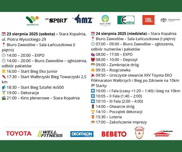 W dniach 23-24 sierpnia 2025 roku Wałbrzych stanie się stolicą biegania za sprawą organizowanej w tych dniach 25. jubileuszowej edycji Toyota EKO Półmaratonu Wałbrzych. To wyjątkowa, dwudniowa impreza sportowa, w której padł rekord zgłoszeń – 3437 tylko na biegi na 10 i 21,0975 km, czyli dystansie półmaratonu. Być może rekordowa będzie także liczba kibiców.