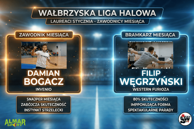 Styczeń w Wałbrzyskiej Lidze Halowej należał do dwóch wybitnych postaci. Damian Bogacz z Invenio oraz Filip Węgrzyński z Western Furioza zgarnęli statuetki dla najlepszych graczy miesiąca. Sprawdź, co zadecydowało o ich wyróżnieniu i jak ich dyspozycja wpłynęła na układ tabeli.